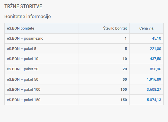 You can also pay for individual AJPES services by clicking the button of the selected services package (e.g. eS.BON 100-unit package).