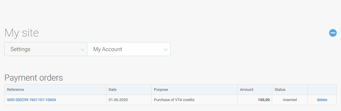The payment order is assigned the "paid" status when AJPES has received the funds in its bank account. An AJPES representative will send you an e-mail notification to the address you provided when preparing the payment order, informing you that funds have been received and that the VTA balance has been increased.